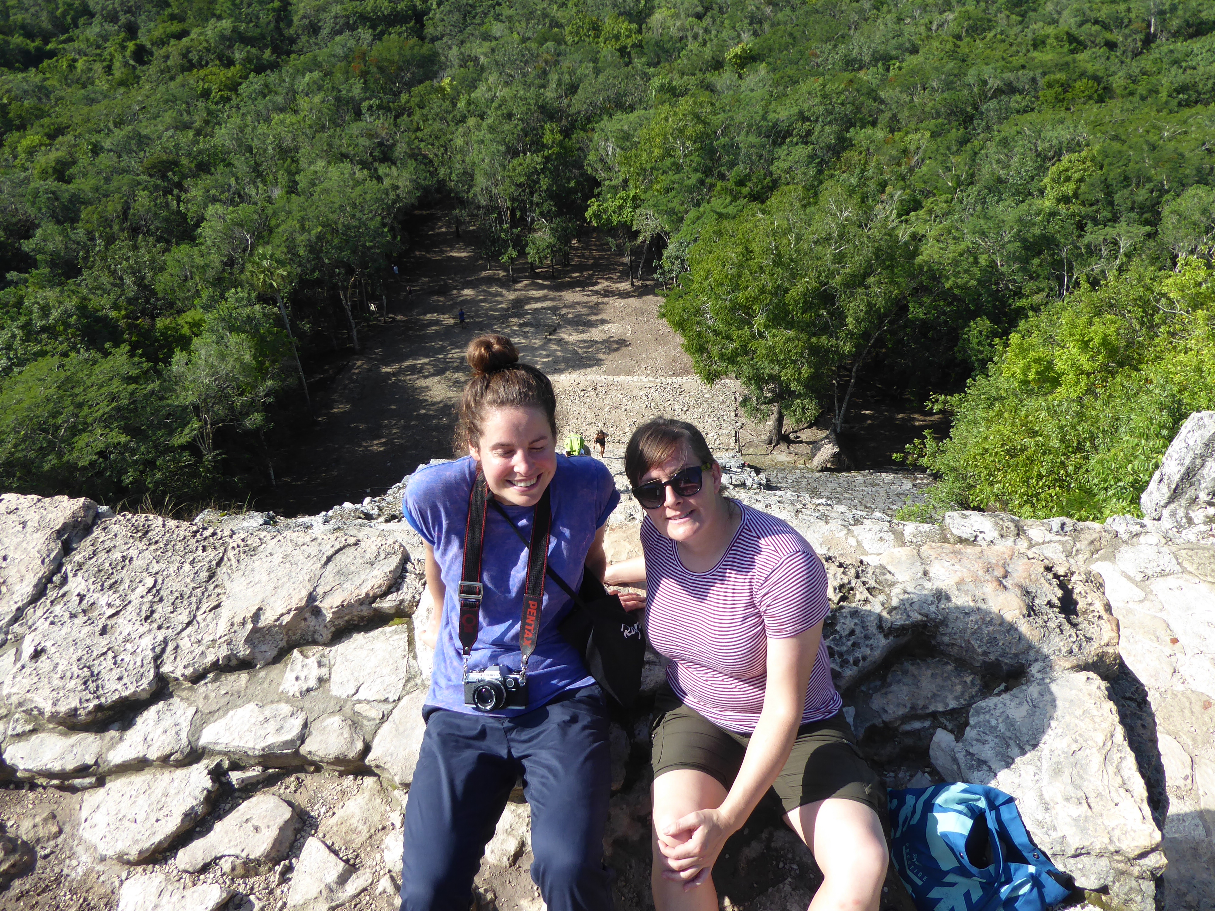 Then we rented bikes (#55 and #96) and rode to the big pyramid – which was 38 meters tall. We hiked up the large steps to the top, there was a rope to helo. The site was starting to get busier, and it was now really hot! The view from the top was great, and we had a few minutes spotting small hills in the landscape – now that we knew they were probably Mayan ruins they were more interesting to us. Getting down the giant steps was harder that the ascent.
