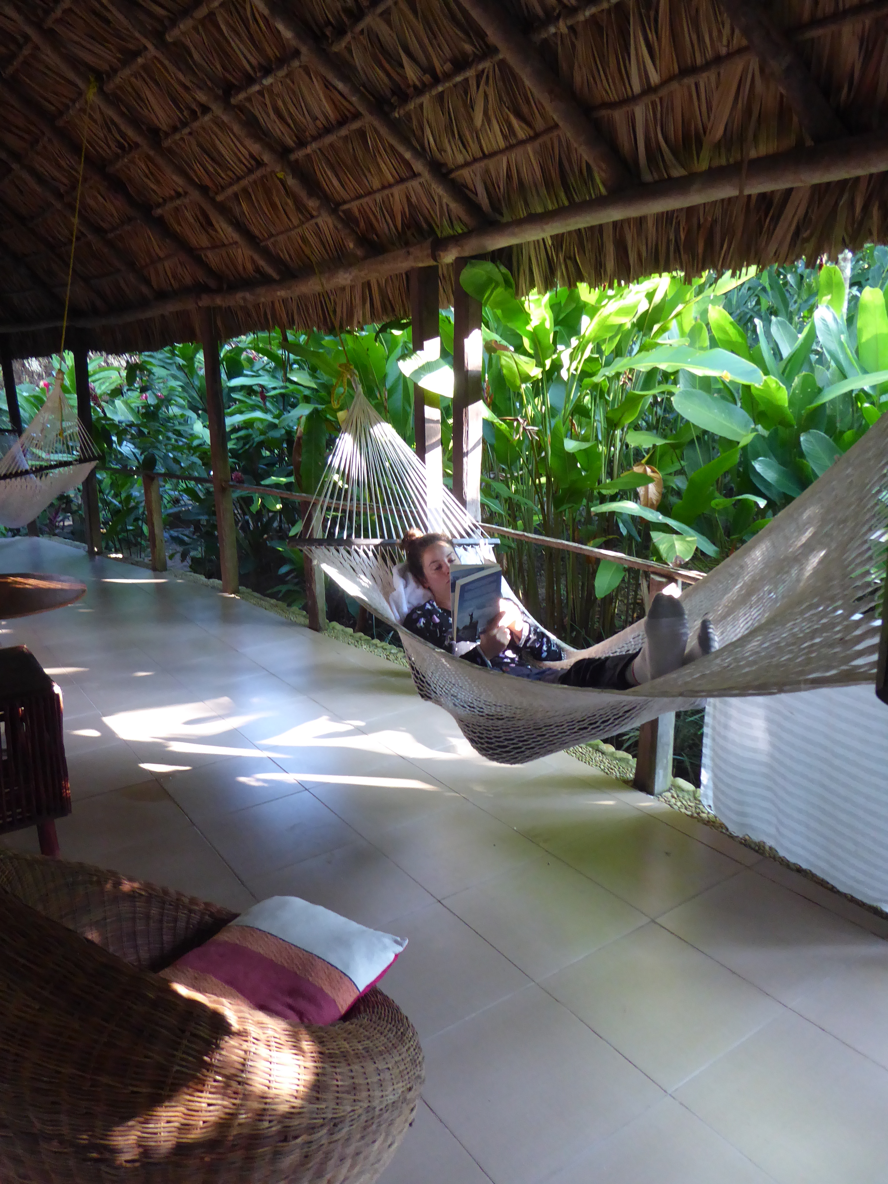 Our hotel was at the top of a short drive which revealed a manicured jungle paradise with a few cabanas for sleeping in. I showered and immediately fell asleep. Exhausted. Eddie snoozed in a hammock. It was so relaxing, and just what we both needed after our illnesses and overnight busses.