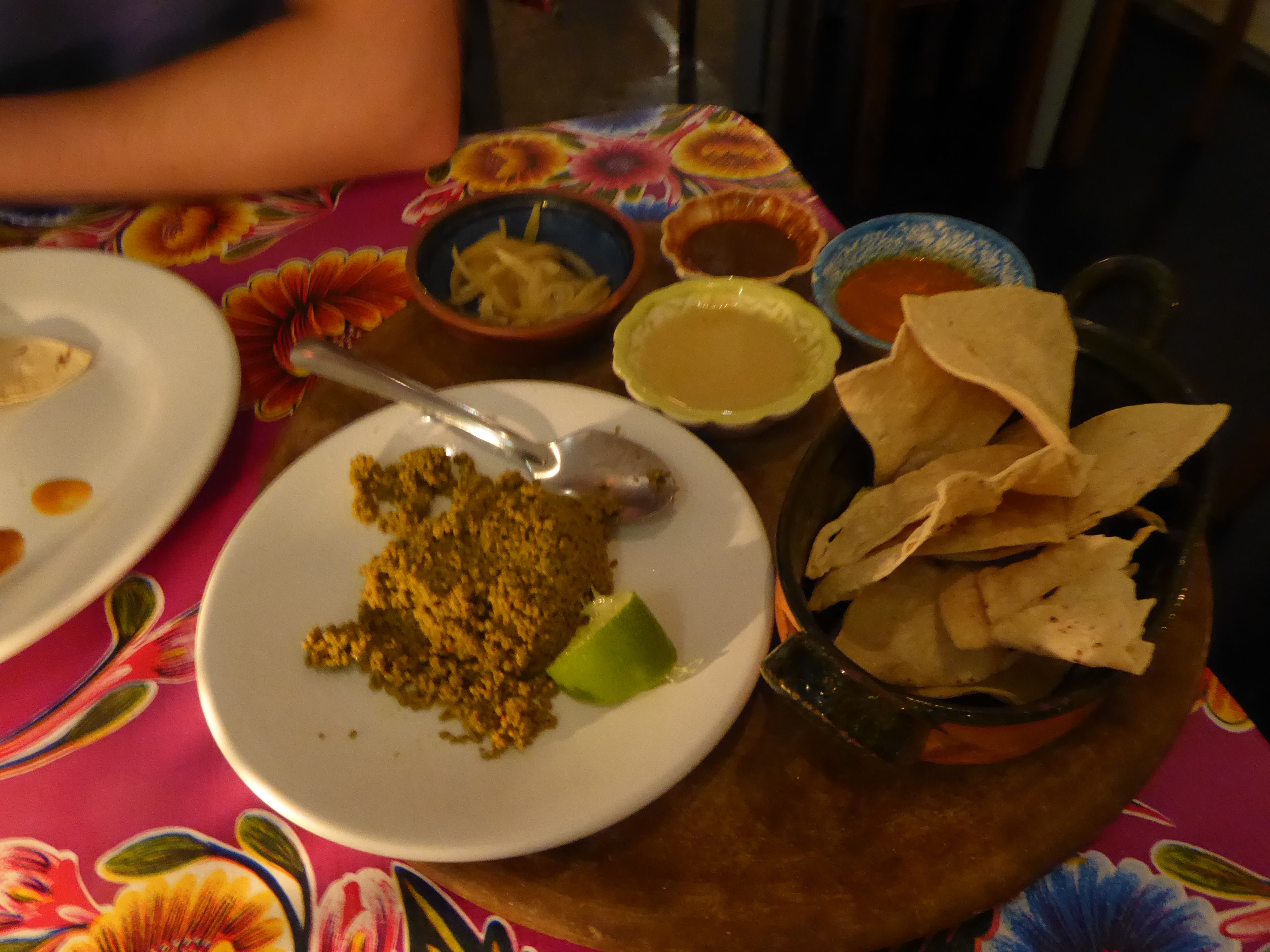 Sophie denied that she needed food, but we went for tacos and she had two good ones, and one of the slimy pork fat and skin local delicacies. It was a mistake. The vendor had a good giggle at her reaction, and did not charge us for it.